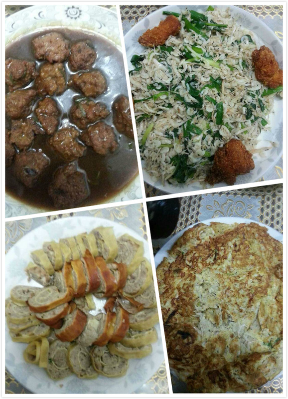 首先是老公作了一个干豆腐夹肉馅,他准备了葱花、姜、各种调味品腌制好馅,然后用干豆腐卷好,放到蒸锅里面蒸熟,最后取出晾凉,待晾凉后切成小片装入盘中。老公的菜做好了,接下来轮到我了,我先做了宝贝喜欢吃的肉丸子,貌似丸子炸的有点过火,所以颜色看上去不是太好看,后来调制汤汁的时候,不知道怎么回事,蚝油被弄得黑乎乎的,看着是不怎么有食欲呀。然后我又分别作了鸡蛋饼和小虾炒韭菜,这两个菜很简单,火候问题这回我掌握的还不错,不过因为要给宝宝吃所以咸盐放少了,卖相还说得过去的同时,味道又欠缺了一些。
