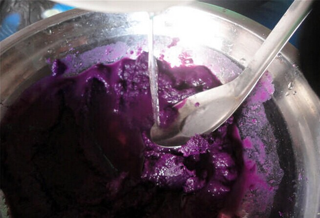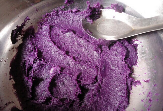 待紫薯蒸熟后,用家里喝汤的小勺子或者是擀面杖把已经已经很松软的紫薯压成泥,如果有点干,可以少放一点点的水。