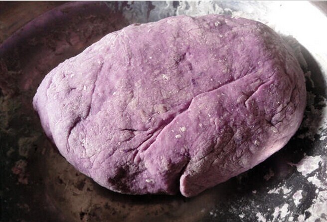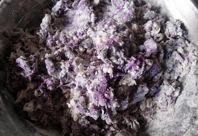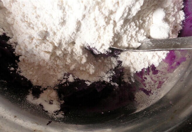 紫薯泥压好后,就需要把面粉倒入紫薯中,然后大力揉搓,慢慢地紫薯和面粉就会均匀地成为一条,待用。