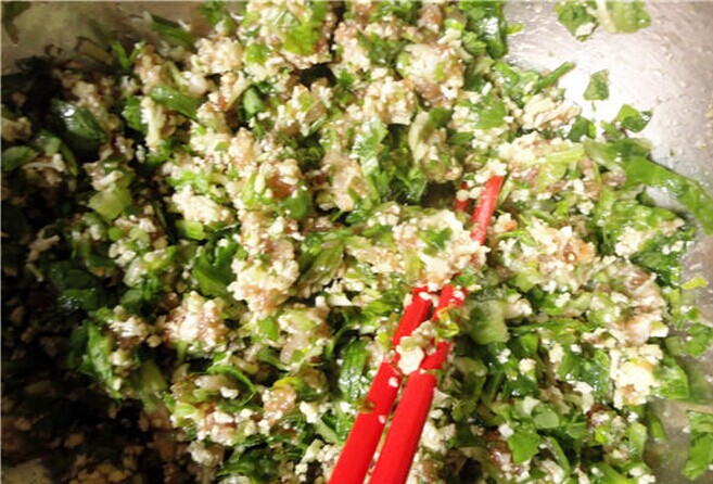时间刚刚好,等我把面粉活好的时候,妈妈已经准备好了饺子陷——青菜肉陷,荤素搭配,营养均衡。