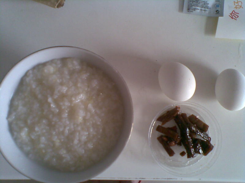 日期:6月5日 早餐内容:稀饭、鸡蛋、咸菜 心情说明:今天早上,喝了一碗稀饭,吃了两个鸡蛋,还有从超市买的小咸菜。小咸菜很咸而且还有辣味,我很喜欢。我的心情很平静,很悠闲。一会要带闺女出去玩。 照片: |