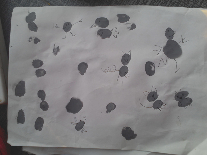 她看到了一幅上面印着她的脚手印,还是去年的,于是一时来兴,要再印!我知道阻挡不住,只好给她备东西,并申明天冷,不能印脚,孩子开心的答应了! 我搞卫生去了,让她一个人印,一抹阳光晒到阳台上,有些暖暖的感觉,于是我没错到陪孩子玩一把!我找来了《我来画》这套书中的手印画做参考,和熠一起来印! 熠独立完成的手印! ![]() ![]() 首先,我们来印一些灰色的圆手指印子,然后加笔画变成想要的动物或其他东西! 这张,我和熠轮流来,一人一个,感觉不这错! ![]() 熠一如既往的喜欢她的彩色毛毛虫,因此乐此不疲的印了起来。 阳光照耀到阳台,熠在认真的模仿书上的花和毛毛虫! ![]() 但我觉得孩子每天应该来点新的东西吧,于是就要求她照书的画一只蚂蚁出来,可熠有懒惰心理,不愿意多想多动,就是不肯,于是我就自己动手画了起来,而且装也不高兴不理她的样子。 这是我为了刺激熠而自己做的画!我尝试着做与她不同的东西及之前我们没尝试的东西! ![]() 熠终于肯尝试自己来画一个了!我开心了,一个劲的鼓劲她,说相信她做得好,一定能画出美丽的蚂蚁来!熠兴致更高了,于是更多的作品出来了! 这是熠在妈妈的带动下独立完成的带皇冠的小蚂蚁!熠有些心急,颜料没干就用笔去画!