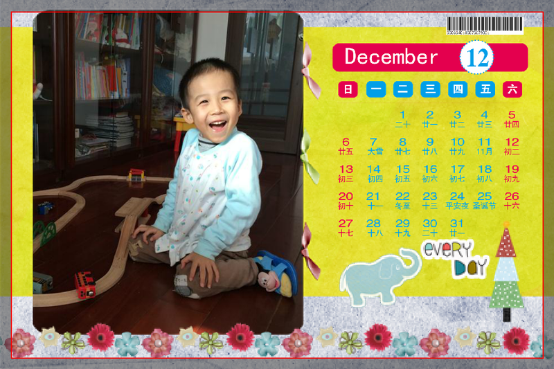 自制台历做过两次,第一次一戈在妈妈肚子里--主要秀的是妈妈的孕妇照,当然有爸爸陪同;第二次一戈还不到一岁,主要是姑妈给一戈拍的照片。看小家伙对台历的兴趣不大,后来妈妈就放弃了。