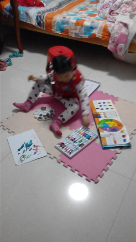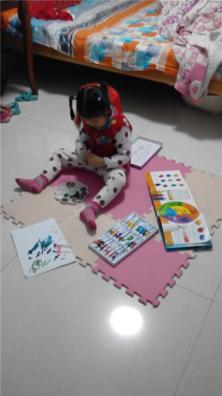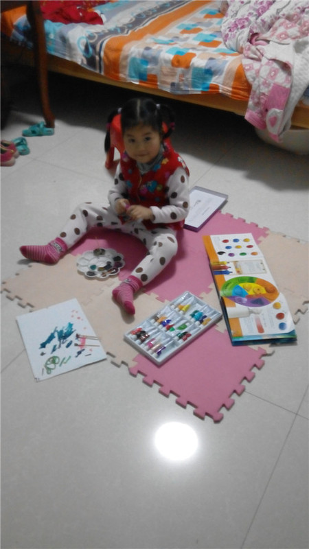前段时间得了一本《小眼睛大发现》,里面有对颜色的由来的演示说明,我们娘俩玩的不亦乐乎,刚开始,我用水彩给闺女演示了一下黄色+红色=橙色、黄色+蓝色=绿色、红色+蓝色=紫色,然后我就被老公叫去修理电脑去了,等我修好了电脑回来,发现闺女把好多种颜色掺到一起了,说是要做蛋糕,把自己变成了小花猫,而多种颜料混合成了巧克力颜色!晚上讲完睡前故事的时候,我们娘俩还在讨论颜色的问题,闺女牢牢的记住了三原色相互之间的转换了。