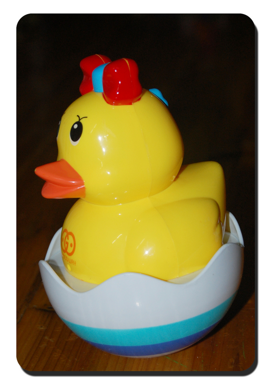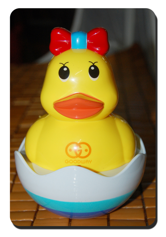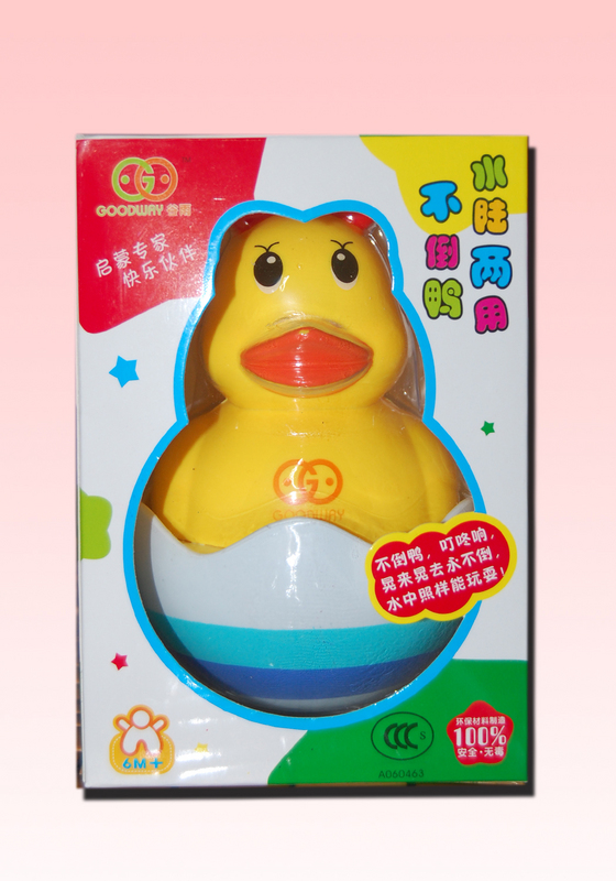 呵呵!来晒宝贝的六一节礼物啦!这些可都是妈妈通过自己的辛苦努力赚来的呢 !大家看啊!这是一款不倒翁玩具——水陆两用不倒鸭。鸭子的颜色很正,很漂亮的。大家注意哦 !这是两用的呢!既可以在地上玩又可以在水空里玩!这样宝宝洗澡妈妈就更轻松了。而且不倒鸭摇起来时,还会“叮咚叮咚”作响,很能吸引宝宝的眼球哦 !