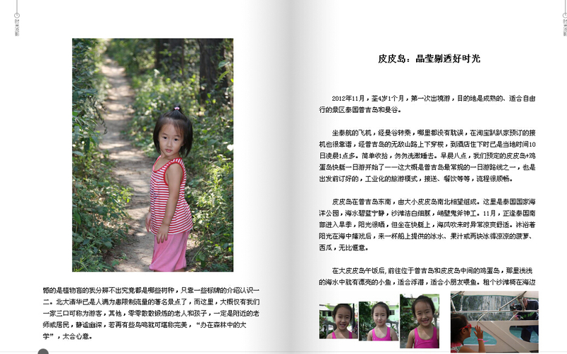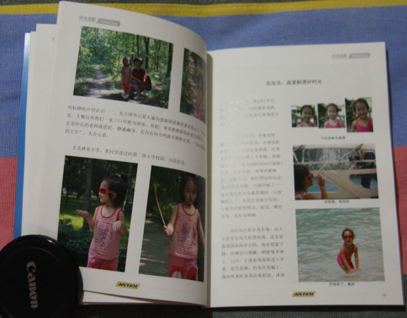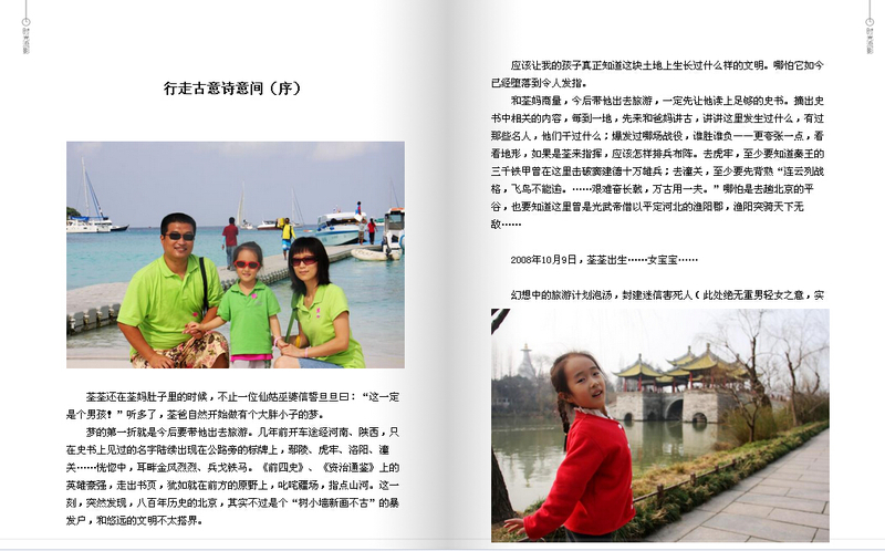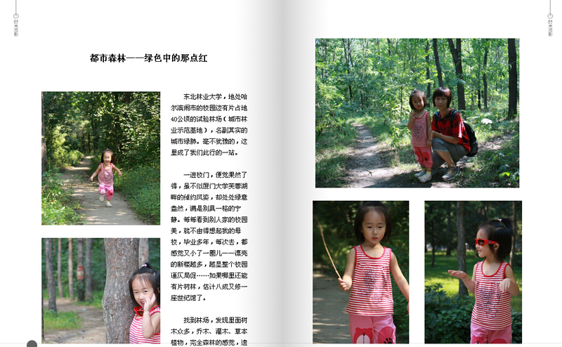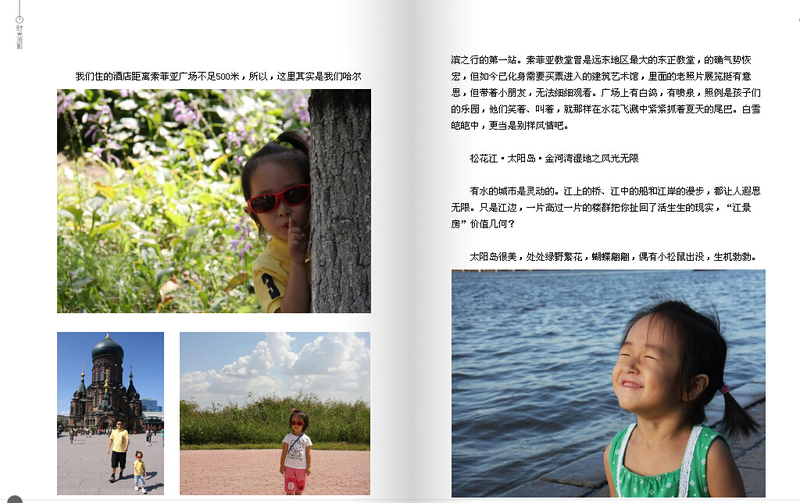 第二次行程是荃2岁10个月,入幼儿园前的哈尔滨之夏。小荃的头发长了,名副其实的小姑娘样了,乖也顽皮。中央大街、索菲亚广场、太阳岛、金河湾、东北林业大学林场,透亮的蓝天与热情的阳光包裹着我们,那个已经拖着行李箱上路的小女孩,举手投足间有点酷有点坏有点可爱。 接下来的行程,几乎全部在地带里发过帖子——那时我们已是这里的活动控了,不再一一详述。相信未来的日子,会有更多更美好的行程,那将是留给未来的精彩的光影记忆。 顺便说:在时光流影网站上做书真的不难,前提是要认真读透做法;图文排版全部自动生成,一方面体现了一键成书的便捷,一方面也有些小小的不完美,有些图的大小和我想象的不一样,估计更熟练后能掌握规律,更好的编排(刚刚又去看,发现新版本有了新变化,更好看了)。还有些小瑕疵是自己的不仔细造成的,比如错别字,以后一定认真校对,太匆忙真的难出精品。