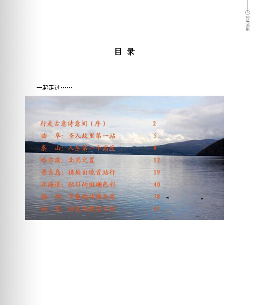 书的内容是按时间排序的,2010年9月的曲阜、泰安,2011年8月的哈尔滨、2012年11月的泰国普吉岛和曼谷,2013年10月的日本北海道,2014年1月的扬州与南京。原计划还有最近的台湾,但一来我的游记还没写完,很多图片没整理,二来做到70多页时发现已经到扬州了,100页的内容无法容纳太多——干脆,我在书名上加了(1),以后再继续(2)、(3)……