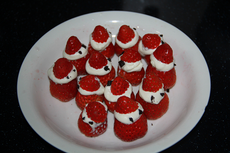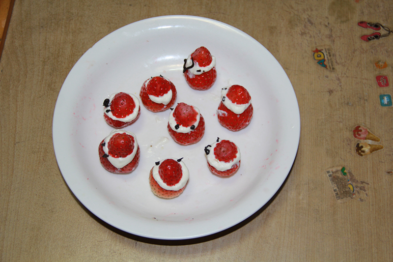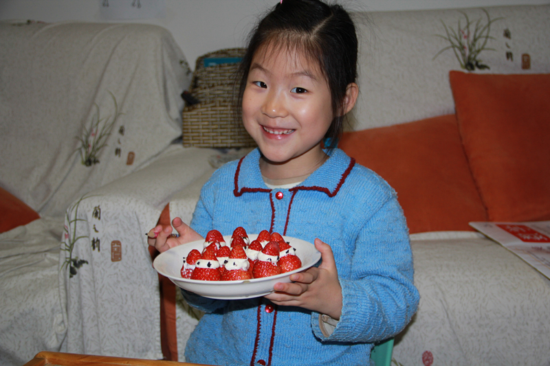 ![]() 这是一月十五号晚上的事情,那天是敬仪六岁的生日,对于这一天俺们期待许久了。生日礼物、生日蛋糕、生日大餐一个都不能少啊!除了这些之外,那天还有一份生日的特别惊喜,那就是DIY圣诞小雪人。提到圣诞小雪人就要感谢俺的同事大芳童鞋,大芳阿姨的烘培事业干得风生水起,时不常就出现一两个新产品让俺们饱饱眼福。这个圣诞雪人第一眼看到我就特别喜欢,想要做给敬仪看看吃吃,小家伙肯定会超级开心! 大芳阿姨特别有心,十五号早上带来了给敬仪做的生日蛋糕,又带来两个裱花袋。裱花袋这个东西以前俺是闻所未闻的,大芳阿姨开始烘培事业之后,俺才慢慢听说到这个工具。裱花袋顾名思义就是裱花用的,将奶油、巧克力等原料放入特制的塑料袋中,扎紧一头的袋口,另一头是密封的,用消毒过的剪刀剪开,往蛋糕上挤裱花袋里的内容物,就可以出来许多漂亮的造型。这个过程就叫裱花。虽说俺不会做饭,不会烘培,但是对于美丽的作品是超级感兴趣啊,所以对于制作流程大致也有些了解。 ![]() 因为奶油容易融化,所以这个圣诞小雪人要现做现吃。因为了解俺这个笨妈,大芳阿姨特意多带了一些做雪人的原料,先带俺做一次,以免晚上回家做不成,就得让宝贝失望了。十五号那天的办公室下午茶时光,除了固定曲目咖啡之外,大家还吃上了大芳和敬仪妈联合料理的圣诞小雪人。 十五号那天晚上回到家,吃过敬仪的生日大餐之后,姥姥姥爷外出锻炼去了。俺让敬仪在客厅做作业,自己悄悄去厨房忙活开来。既然是生日的惊喜,当然不能太声张啦!十多分钟之后,当笨老妈端上一盘红白相间、新鲜可口的圣诞小雪人来到敬仪面前,果然把小家伙给美翻了。 ![]() 一大盘雪人俺们几个人一口一个,几下就给吃光啦。敬仪嚷嚷着要自己制作雪人,好咧宝贝,正好材料足够多,还能再来一盘,于是小家伙和妈妈一起来到厨房,携手打造母女亲子版的圣诞小雪人。其实制作方法特别简单,先将草莓洗干净,用淡盐水泡二十分钟,控干备用。再将草莓的尖头切掉一小部分,当做圣诞雪人的脑袋。红红的草莓摆在白色的盘子里很耀眼啊! ![]() 将奶油裱花袋里的奶油均匀地挤在下半部分的草莓身上,挤的时候要用力均匀,尽量别让奶油流到草莓上影响美观。因为奶油容易融化,建议先放进冷冻室呆一小会儿。挤裱花袋的时候尽量别握太紧,否则手温会很快将奶油融化,做出来的雪人脸蛋就花了。 ![]() ![]() 所有的草莓上都挤好奶油之后,再将草莓的尖顶逐一盖回去。这样,圣诞雪人的脸蛋和头部就完成了。 ![]() 将巧克力裱花袋剪开,往雪人的脸上点上两只巧克力做的眼睛,雪人就算大功告成了。需要注意的是,巧克力是固体,跟奶油完全相反的性状,一个怕化,一个怕干。所以要将固体的巧克力裱花袋放进热水中泡一会儿让它融化成液体,再轻轻往雪人脑袋上挤。挤着挤着感觉有些发干挤不出来的时候,再放进热水里化一化。 第二盘圣诞小雪人也大功告成啦!爸爸赶紧过来给俺俩拍张照片吧。 ![]() 这第二盘雪人也是一下子就被小家伙给干光了,最后留了四个给姥姥姥爷意思意思。圣诞小雪人好吃好做,比单单吃草莓有吸引力多啦!!