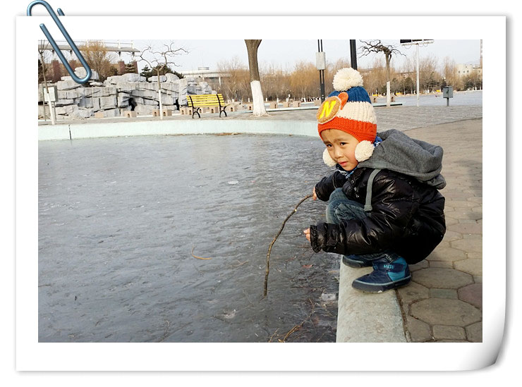 虽然公园的湖面结冰好早就可以玩了,但是由于谦一直上学我们去公园玩冰的机会也基本上是没有的。上个周末适逢宝贝没有兴趣班的课要上,又赶上姥姥来看小家伙,于是就成全了这次周末公园玩冰的快乐之行。我们去公园的时间还比较早,小家伙先是在公园里玩一会,姥姥岁数大了,在冰上行走的话让妈妈很是担心,上岁数的人伤不起啊,所以还是在平路地方陪着小子玩一玩吧。谦让姥姥陪着在草丛树林里寻找喜欢的棍子,这小子想到冰上玩棍子呢,几经寻找终于找到了一根心仪的,于是玩冰的序幕正是拉开吧,小家伙玩冰的时候,姥姥则是去了超市给小家伙买好吃的去了。看照片中,谦正蹲在结冰湖面的边缘地带,这里的冰碴比较薄,用棍子敲一下,上面那层脆脆的很容易就碎了,然后拿起其中的碎冰皮来玩。