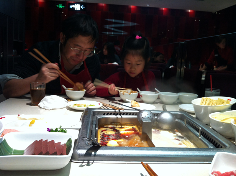 说到海底捞火锅,估计很少有人不知道吧。许多年前俺就听说过这个火锅店,那时候俺还在学校工作,同宿舍的女孩儿经常提到海底捞火锅,海底捞火锅之所以吸引她是因为在等餐的时候可以有免费的饮料喝,免费小吃吃;有人给免费擦鞋,还能免费做指甲。就算等着等着改变主意不想在这儿吃了走人,也没关系。人家就用这招来吸引顾客,人家不在乎这点投入,用现在流行的话来说就是“有钱就是任性”。 后来跟老公结婚后,又听老公提到海底捞火锅,他和朋友去吃过一次,说味道很棒,想带我去吃一次,但这么多年愣是没有如愿。对于吃饭我向来不大在意,美食对于我的吸引力很有限,要是顺便吃吃还行,大张旗鼓地去吃还真不是我的风格。圣诞节之后的那个周六黄昏,我们仨来到位于太阳宫的玩具反斗城挑礼物,反斗城边上就有一家海底捞,老公立马提议晚饭在这儿吃。说好多年就想带我来了,今天正好,这就叫选日不如撞日吧。于是我们拿了号先去反斗城挑礼物。等我们两个小时之后,八点左右挑好礼物再去海底捞,时间正正好,可见这儿生意有多火爆啊。不过等待的时候可以享受到的免费服务,俺们是一个都没享受到,亏啊! 俺们这顿火锅一共吃了两百多块钱,依然是眼大肚子小的节奏,稍微点多了那么一点点。吃完结账才知道交通银行的信用卡客户可以每周五享受满150减100的福利,俺们又亏了。俺们要了一个清汤锅,一个辣锅。清汤锅敬仪和爸爸吃,辣锅俺吃。所以敬仪和爸爸坐在一起,俺坐他们对面。终于轮到敬仪爸伺候闺女吃饭,俺这个当妈的终于可以踏实吃自己的,消停一回了。 ![]() ![]() 有娃之后,俺这个辣椒控放弃了自己的喜好,终于逮到机会吃辣的了啊!还是辣的过瘾啊!不过说实话,俺真吃不出海底捞火锅有多好吃来,不就是火锅嘛,对于俺来说呷哺呷哺和海底捞貌似没啥区别,除了价格上相隔巨大以外。不过海底捞有一些独特的吸引人之处,除了等餐的尊贵待遇之外,还有表演哟。有一个穿白大褂的厨师在桌子的空隙间给客人表演面条绝活,甩来甩去,扯来扯去,抛来抛去的,引来无数喝彩。另外海底捞火锅的底料特别丰富,各种各样的调味料有好几十种,客人可以随便选用。还有一些水果比较吸引敬仪,我们吃了柚子和圣女果。 海底捞的贴心之处在于关注细节,服务员见我和老公都戴眼镜,特意给我俩一人一个擦镜纸,以防火锅的热气蒙住眼镜;特意给我们拿来两个小塑料袋装手机,以防溅上调料汁儿啥的。对于带孩子来的客人,在入座时特意送来一小盒塑料积木,质量虽然没法跟乐高积木比,但凑合玩玩还是可以的。毕竟是额外的礼物嘛! 我们点了牛羊肉和一些蔬菜、面条、鸭血、午餐肉、豆腐等等,敬仪还点了四个菜呢。吃到最后大家都肚皮鼓鼓,心满意足。 ![]() 吃饱喝足之后,敬仪离开餐桌开始搞怪,她将围裙在膝盖处夹住,看起来像穿着一条工装裤;又学着卓别林走鸭子步,吐舌头做鬼脸,装僵尸吓唬爸妈。每当这个时候我们知道是宝贝最开心的时候。等我们彻底吃完,收拾好一切回家已经接近十二点了。这一晚上过的!还好是周六,还好第二天没安排啥活动,可以好好在家歇歇!老公心心念念许多年的海底捞火锅,终于带老婆孩子吃上了,老公很是满足啊!!敬仪吃得那么开心,老妈也很满足!幸福人生不就是和家人在一起吃许多顿许多顿饭嘛!