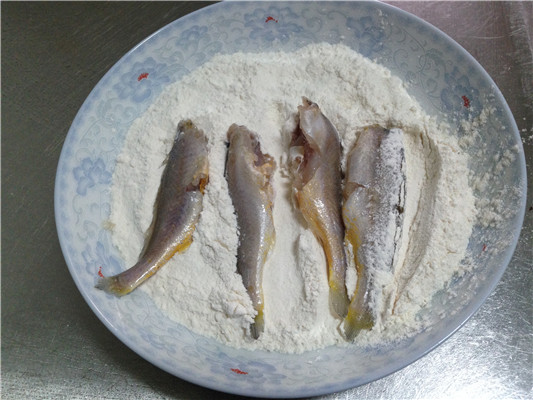 腌一个钟头吧,差不多就可以 !时间长了,怕是会太咸,锅里放多点儿油,然后给黄花鱼沾点儿面粉,这样放进去,不容易粘锅!