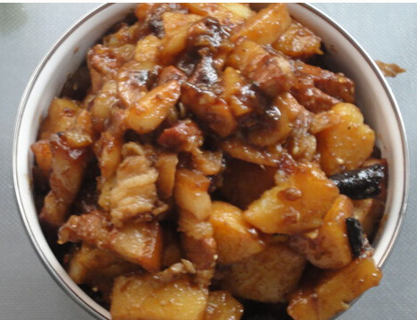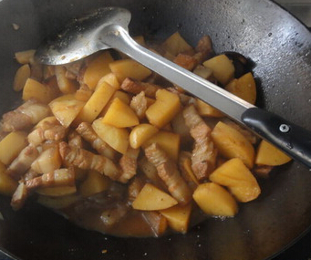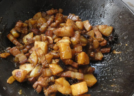 下面就细细说说我的烹饪步骤: 主料:五花肉一斤、土豆2到3个。 调料:白糖、酱油、盐、料酒一个都不能少,同时还需要准备一个草果、八角三四颗、姜蒜适中、干辣椒适中 第一步。上好的五花肉洗净后切成大小适中的小块,放点料酒稍微腌制一下;姜、蒜切片,干辣椒切小段备用; 第二步。切好后把五花肉入沸水焯一下,2-3分钟即可,这样好像可以去腥,焯好后盛出沥水备用; 第三步。炒锅内放少量油,小火,放入草果、八角,再放入白糖2-3小勺,不停搅拌,搅拌均匀,等待白糖融化变黄浮起,依次放入姜蒜片、辣椒段炒香; 第四步。放入备好的五花肉、土豆,炒至金黄,然后加入冷水,盐、酱油,水量没过土肉、五花肉即可,大火烧开,小火炖30分钟左右; 最后一步。待水分即干时大火收汁,盛盘上桌。 哈哈,总结一下我的制作经验:个人觉得此次尝试有两点不足,首先是土豆放多了,有点喧宾夺主,以至于最后有点浓稠的感觉;其次是收汁动作慢了,差点糊了,呵呵,下次再接再厉! (PS:因为这才是我下班后才做的,时间有限,只能拍两张,全家老小都等着我的菜吃饭呢,所以中间细节部分来不及照了) 加水煮时的照片: