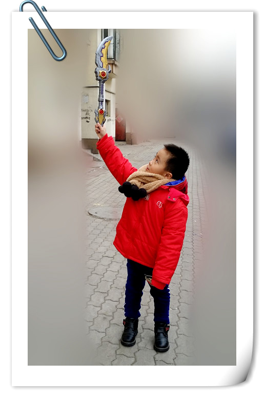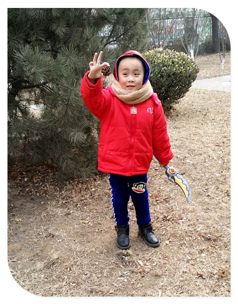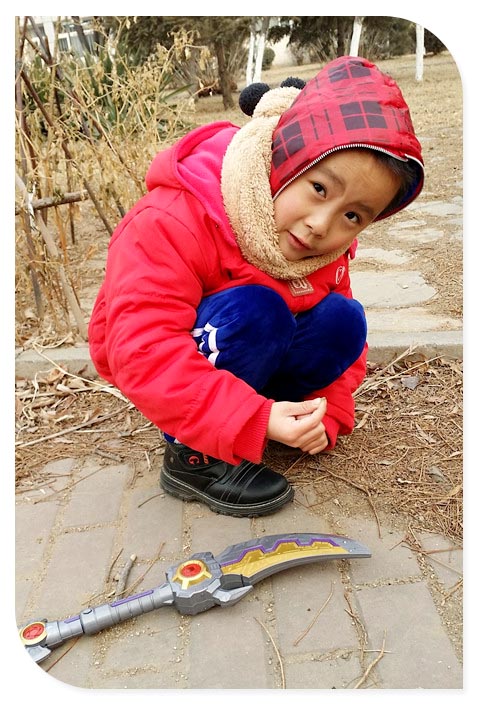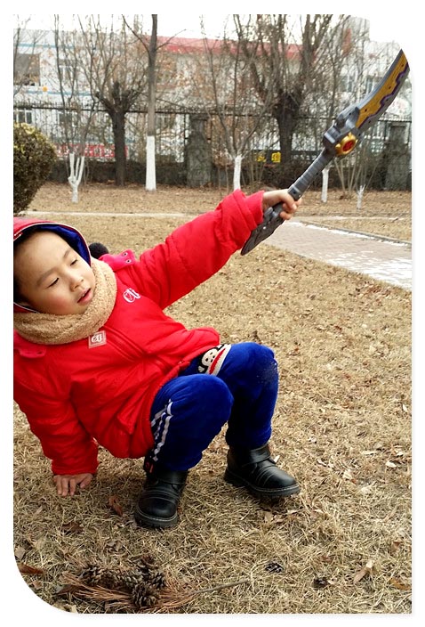 这天带小家伙去上美术课来到校园的时候,由于距离上课还有一段时间,前一个班级还没有下课,小家伙也没处可去,就在校园里玩玩打发一下时间吧,偏偏那天还有些冷,给小家伙全副武装后才放心让孩子在校园里玩的。宝贝出门上课的时候还带了武器出来,具体名字不知道,好像是铠甲勇士里面的吧,反正此玩具成了宝贝本次故事当中的一个重要工具了。