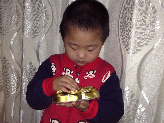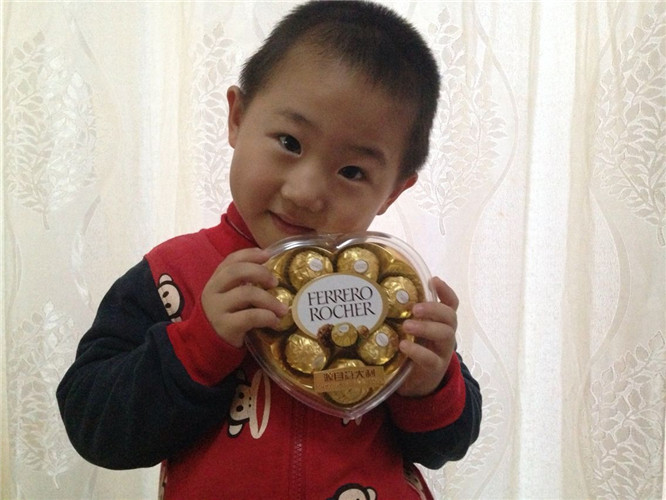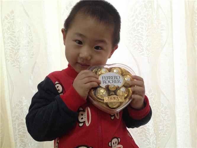低着头专注的盯着巧克力,生怕它跑了似的,这个小吃货,呵呵