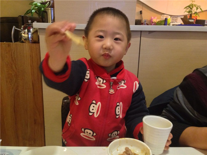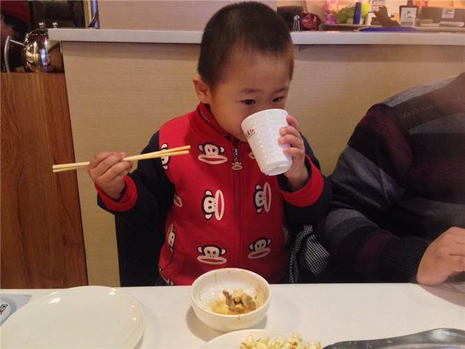 小家伙迫不及待的喝上了,来,先干一杯
