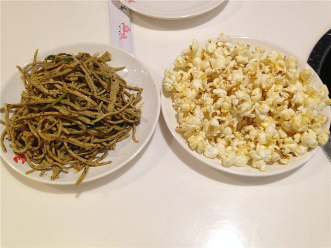 开始上菜了,爆米花和拌豆腐丝都是额外赠送的,要说爆米花可是昊昊的最爱,这回又对口了!