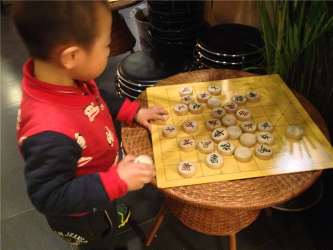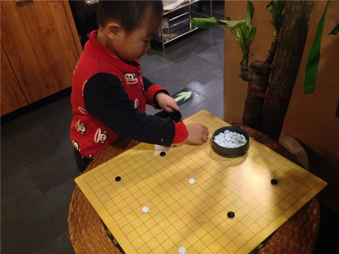 这娃儿胃口真是小,没吃多少就饱了,不过娃儿又发现了新大陆了,这家餐馆里的休闲区竟然还有围棋和象棋供人娱乐,小家伙也被吸引了过去,似乎对这个很感兴趣,看,还像模像样的下起棋来了!
