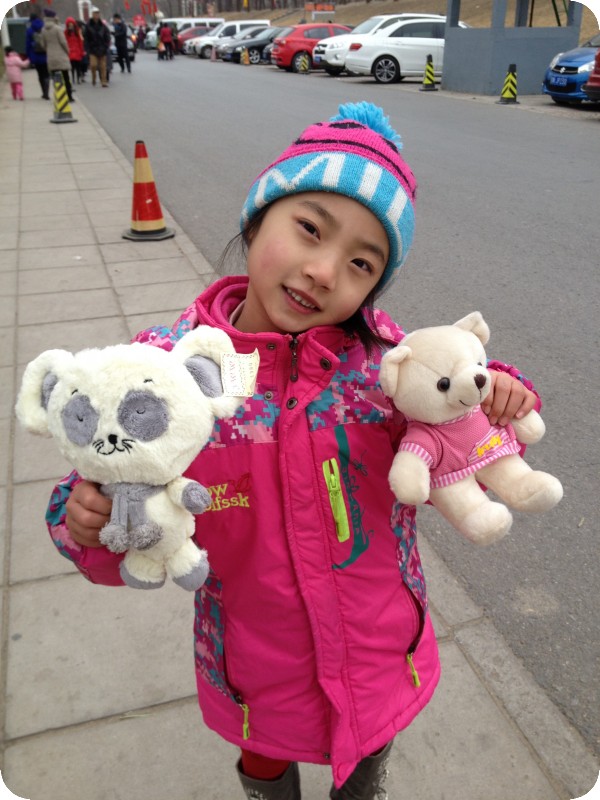 随后去玩,才发现改变了去年直接收费的方式,需要在固定的窗口购买游戏币,2元一个,基本上每个游戏都是10个游戏币,也就是20块钱,一一爸妈给买了50个币。贝贝先玩了蹦极,然后拿着游戏币打算去玩攀岩,可谁知来到这片场地,却告知这里不用游戏币,可以单买票或者办卡,真是的,这不是折腾人吗?贝贝玩攀岩,也不知道是太冷还是什么情况,她说害怕,不玩了,都不到两分钟,明明去年暑假在老家她都爬到最顶上了,欣慰的是,玩这个还免费送一个玩具,自己挑,好几个品种,贝贝挑了个老鼠毛绒。又去玩了一个袋鼠跳,准备回家了,可这时,小家伙突然对那种扔球、套圈之类的游戏感兴趣,更确切的说是对人家挂在那的毛绒玩具感兴趣,想玩,可大家都知道,那种能够得到大毛绒的人是非常非常少的,尤其是那个套圈,我们在那看了半天,一筐的圈,一个都套不上去。最后贝贝选择了拉绳,就是从一大把绳子中,选一根绳子拉,拉出来是什么玩具就得到什么,贝贝选了一根,拉出来一只小熊,美滋滋的抱着走了,相当于20块钱买的 庙会,就这样逛完了,真是没有意思啊,明年回老家过春节了!!