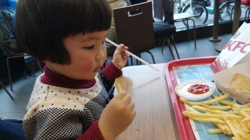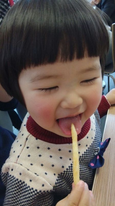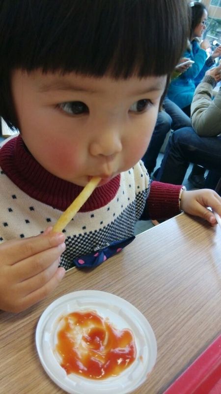 我把点的食物拿过来以后,两个小家伙一起过来了,两人去洗手了以后就开始吃了,先吃薯条,妹妹吃薯条的样子真是萌翻了,超级可爱,让她笑一个,妹妹就眯起眼睛笑起来,一会儿睁大眼睛,大大的眼睛真可爱。点点只顾自己吃了,没有吃午饭,所以吃得还算比较好,先吃了一个鸡翅,接着吃了一个红豆派,还吃了大半个汉堡包,把可乐吃了一半,还是比较会吃的。