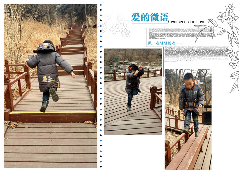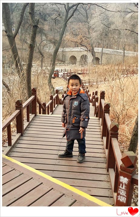 此处木制台阶和路面算是一个有特点的地方吧。夏天的时候这里很美,尤其适合孩子玩耍的,因为对面有瀑布,还有大石头,好看又好玩。小家伙来到这里的时候也兴奋起来,大展拳脚,于是妈妈拿手机记录了宝贝的精彩瞬间。看宝贝的鞋子就知道这山路的土有多大了,我们没有走大路,为了节省时间走的是林中小路,树多、土多,尤其是小家伙一路跑过的时候,这灰土跟着飞扬,鞋子看起来尤其的明显。所以这个爬山啊还是要穿运动鞋的,不但舒服而且也保护孩子的脚丫,这次因为是孩子突然要求的,也只能这样了。照片中张牙舞爪的小家伙的动作是一个比一个有难度的,如果说剪刀手是拍照的经典动作的话,那么对于谦来讲,这个恐龙爪这是必不可少的。