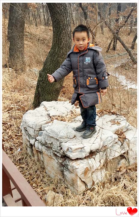 此处附近有个观音庙,爸爸想去上香,谦不肯跟着同去,于是留下来跟着妈妈在这里边玩变等爸爸。看照片,如果想要来到这块大石头上需要跨过旁边的木制栏杆,而且栏杆和石头之间还是有距离的,当时小家伙想上石头上玩的时候,妈妈是要抱着他过去的,可是孩子坚持要自己来,虽然不是很顺利,但是终于完成了,如此通过努力达成自己的心愿是让人高兴的一件事情。小家伙来到石头上还盘起腿来,煞有介事的模仿一下西游记里的唐僧师傅。
