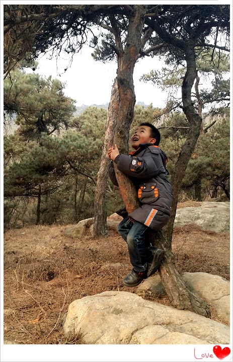 这是我们开始下山的路上发现了这棵造型很特别的树,小家伙很认真的问爸爸是否可以爬到这棵树上呢,想想要是在年轻几年的话,老爸爬这树简直是小菜一碟啊,如今身体胖了不少,动作笨笨的,虽然是为了儿子努力爬树,无奈最终以失败结束,倒是小家伙在爸爸的帮助下在树上美滋滋的坐了一会。