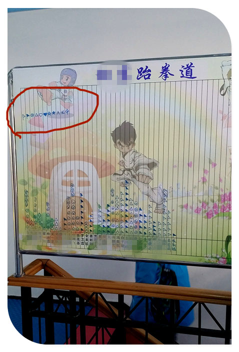 总结一下目前为止孩子练习跆拳道后的收获吧。首先就是礼貌问题,孩子变得更加的有礼貌了。记得谦第一次练习完跆拳道后跟老师再见的时候还是采取摆摆手的动作呢,后来老师为此特意纠正小家伙要给老师鞠躬说再见,看到妈妈的时候也要鞠躬说辛苦了,第二次当谦正确完成老师教给的动作来再见的时候,老师还给小家伙特意奖励了一面小旗呢,这让宝贝开心的很。其次培养孩子积极努力的劲头,练习室内有个记录展板,孩子的学习情况一目了然,以此鼓励孩子继续加油。