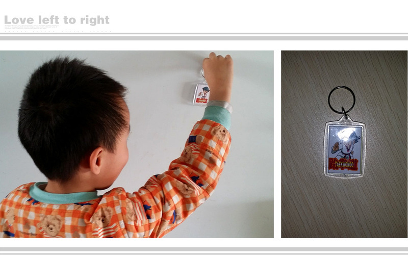 教谦的跆拳道教练是两位年轻的女孩,别看年龄小,但是资历和功力却是颇高的。而且由于教练年轻的缘故吧,能够和这些孩子玩到一块去的。练习的时候,表现好的孩子老师会给予击掌形式的鼓励。每一堂课结束的老师,老师点名,孩子来报自己跟老师的击掌次数,好像3次以上就可以有标识奖励的,从低级开始,分别是空的小红旗,实心的小红旗、小花朵等等。当每个孩子攒够10个标识的时候就可以兑换一个钥匙链,兑换10个钥匙链后教练就会奖励一个大的奖品。 年前的倒数第二堂跆拳道之前小家伙就给自己打劲要好好练习,因为宝贝已经有了9面小旗了,如果表现的好就可以得到第10面,这样就可以换到钥匙扣了。可是那天好像老师没有跟任何一个孩子击掌的,于是小家伙的欢钥匙扣的事情泡汤了。到了年前的最后一堂课的时候,小家伙终于如愿获得了10面小旗,然后找老师开心的兑换了宝贝的第一个小奖励,就是画面是跆拳道小子的钥匙扣,别看奖励小,但是对孩子的鼓励是很大的,小家伙要继续加油很期待那个10个钥匙扣之后的大奖励呢!