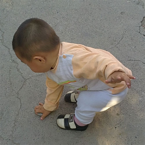 把玩够了手里这块大石头,觉得不够新鲜,又蹲在地上开始寻找更有趣的东西——蚂蚁!秃秃的视力非常好,很多我这5.1的眼睛都没看到的小东西,他却看的真真的!发现地上有只小蚂蚁,赶紧蹲下想用手去捻,可蚂蚁反应多快呀,秃秃手还没落下,它就逃的无影无踪了~~