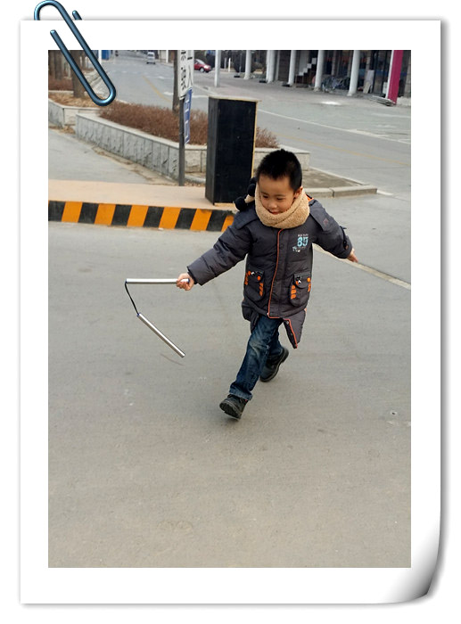 后来发现了这空的塑料桶,于是双节棍又有新用途了,拿着双节棍充当鞭子来打桶,有种抽陀螺的感觉呢,甭管咋样这个比胡乱的耍来耍去的有意思多了,看来有目标很重要啊,玩耍也是如此。玩了一会这个后就离开了,小家伙冷的都冻手了......