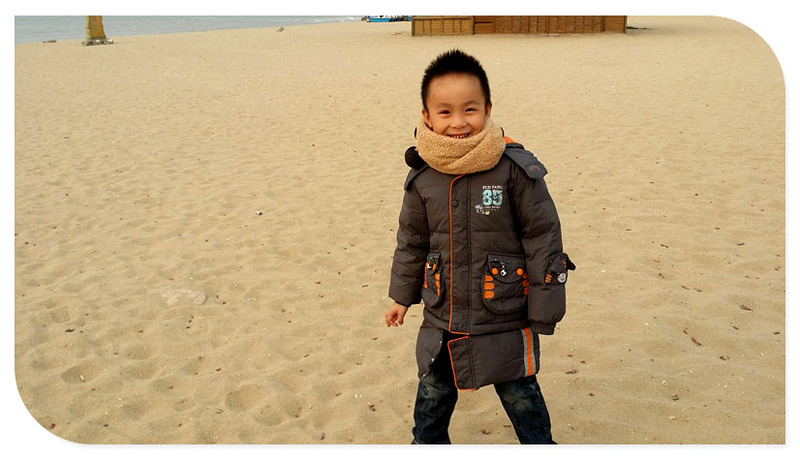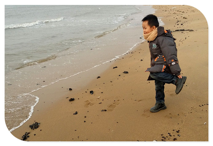 看宝贝这个举动,看到海水就想脱掉鞋子,说是要下海玩水。妈妈和爸爸都不吭声,由着小家伙折腾吧,只要宝贝不嫌凉,冬泳妈妈是支持的。臭小子用手摸了摸海边的湿沙子后又放弃了要玩水的念头了。真是不知道孩子是咋想的,是不是故意逗爸爸和妈妈玩哦......