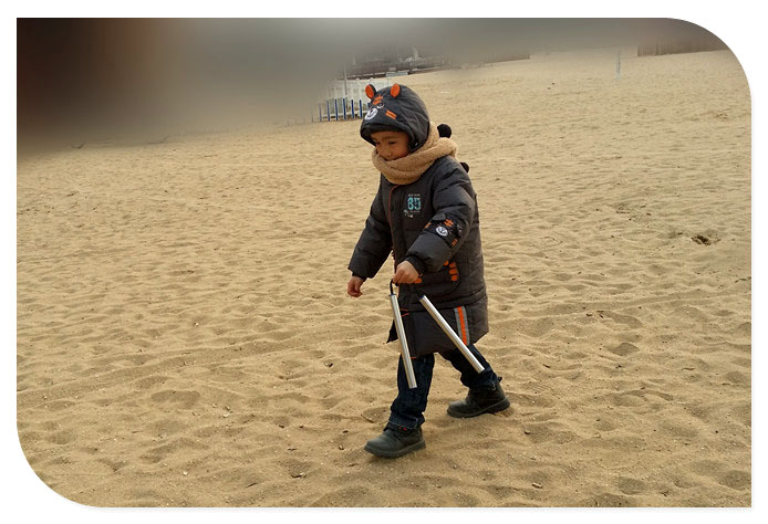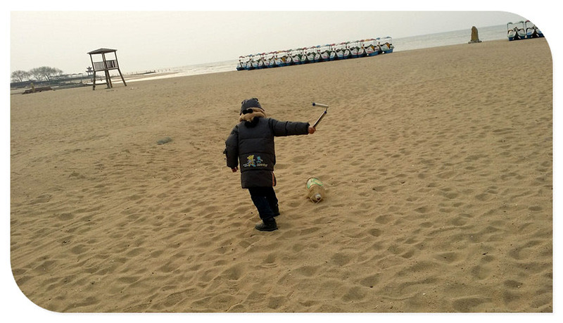 小家伙手中的双截棍还是爸爸去年送给小家伙的圣诞礼物呢,专门为孩子使用的,分量很轻,即便是打到身上也不会很疼,总之孩子玩起来很安全的。不过自从双截棍到手后小家伙玩的时候并不多,主要是因为兴趣不在于此吧。某天晚上小家伙玩的时候不经意见竟然翻出了爸爸曾经玩过的双截棍,那个可是货真价实的双截棍,掂掂分量就很重的,要知道谦爸年轻的时候也是耍的一手好双截棍呢,如今虽然年龄也大,身体也发福,但是双截棍上手还是颇有感觉的,老爸耍几下让儿子也心动起来,于是找出了专属自己的双截棍跟着爸爸一起呼呼哈嘿的玩起来。而且看宝贝玩的过程中突然发现这小子的运动协调能力还是不错的,双截棍的动作有的时候需要换手进行的,就是换手这个 动作小家伙居然可以完成的还不错,让爸爸也感叹一番,而且小家伙也跟着爸爸学用手从身前接身后的双截棍,总之这父子玩的很嗨,两个人乐乐呵呵的尽兴啊! 某天带小家伙出去玩的时候,出门前小家伙特意将双截棍拿了出来放到妈妈包里,看来小子对双截棍是越来越有兴趣了。这次本来没有想到海边的,只是开车路过此处的时候小家伙兴奋起来,一定要去海边玩玩,于是才有了此次的玩耍,要知道那天的风好大,海边好冷,我们在海边玩耍时间估计连半个小时都没有就闪人了,冻人啊......