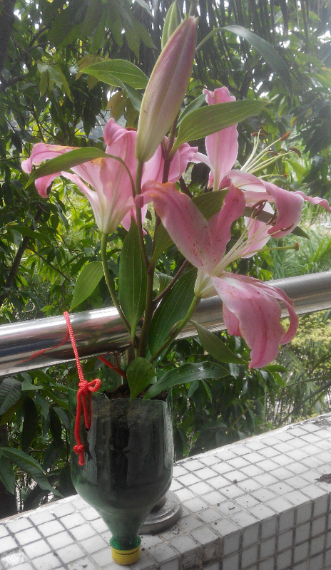 孩子幼儿园上学期放假前,老师就交待了作业,要用环保的材料动手做一个花盆,在假期里种上一些花,等开学的时候带回去。因为幼儿园新开了一个门,要走一条很长的通道,说是要用种上各种的花挂在通道上,装饰漂亮起来。这个作业,也一直在我的心里而迟迟没有动。前几天,我看到家里的大饮料罐时,又想到这个作业了,就做了两个花盆,一个种了一株芦荟,一个则撒了一些芹菜的种子上去。不过那个芹菜种子已经有一年多的了,可能是放太久了都过期了,所以一直没有发芽出来。于是我就想再种点什么。 那天带着孩子去坐双层巴士,去到黄埔古村后,看到有摊档在卖花,卖的就是我们家的那种百合花。我看到店家好像把一支支的百合花种在花盆里,就想着我家的百合花也可以这样种呢。而且这两天,百合花慢慢谢了,正需要找新的出路呢。于是我便动手要把百合花种下来。这样我家的花盆就不够了,需要再弄些花盆回来呢。记得前几天经过楼下的时候,看到有的办公室门口放着一盆盆谢了的年花,想来那是要扔掉的,我就想着哪天去问问他们还要不要,如果真的不要的,我就捡几个回来。结果那天下午我回去后,看到门口已经没有了。问清洁工阿姨,说已经扔掉了,好可惜呀!后来,我去三楼的空中花园,捡了一个空花盆回来。当然这还是不够的,只能自己想办法再制作了。 准备空的大饮料瓶,用美工刀和剪刀裁成两半,在底的那半里,剪出一些边来装饰,再折下来就可以了。很简单呢。这是我小时候就看到亲戚是这样做废物利用得来的灵感呢。![]() 这是我前几天就种的,下面那一圈白色的可以忽略掉,我随手放的。我家的芦荟本来种在大泡沫箱里,但孩子经常跑去那里尿尿,老公又老是倒茶叶进去,以致芦荟的根都烂了。我种的这个芦荟,也是不太行了呢。现在种出来,给晒晒太阳,希望能补救回来。 ![]() 事实证明,我那芦荟是没救了,我只好再搬了支康乃馨上去,再串上一条红绳子,这样带着去幼儿园,好看多了。今天早上孩子带去幼儿园了,希望这支康乃馨可以顺利成长! ![]() 这是另一个大罐子做的花盆,我插上了康乃馨上去种,希望可以种得活。 ![]() 我又用一个瓶子的上半部分,做了一个这样的花盆,绑在阳台栏杆上,插上粉红色的百合花。 ![]() 近照看看。 ![]() 合体的合照。最后一个花盆就是我在三楼捡回来的,唯一的一个像样的花盆。 本作品未经作者许可不得转载,转载请征求作者意见。擅自转载使用,将保留追究其法律责任的权利! 评分记录