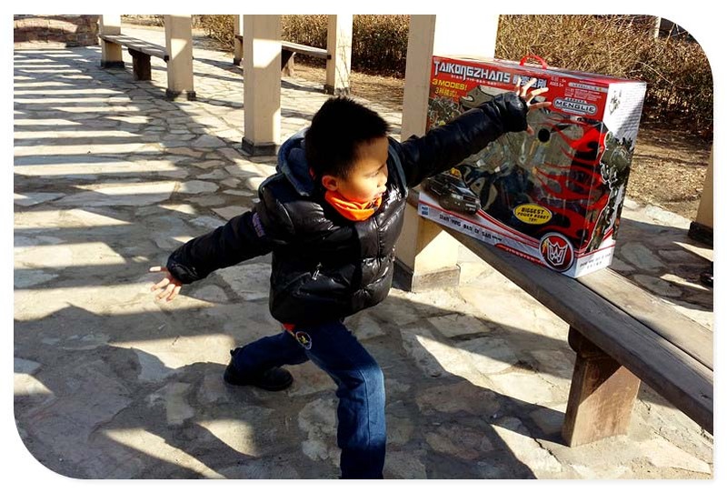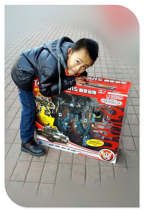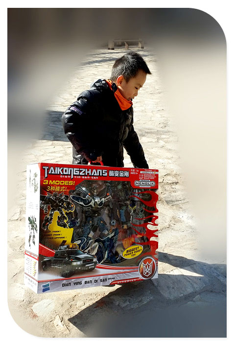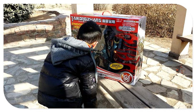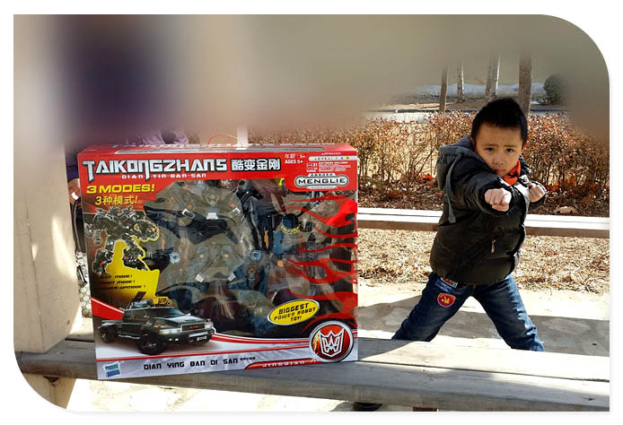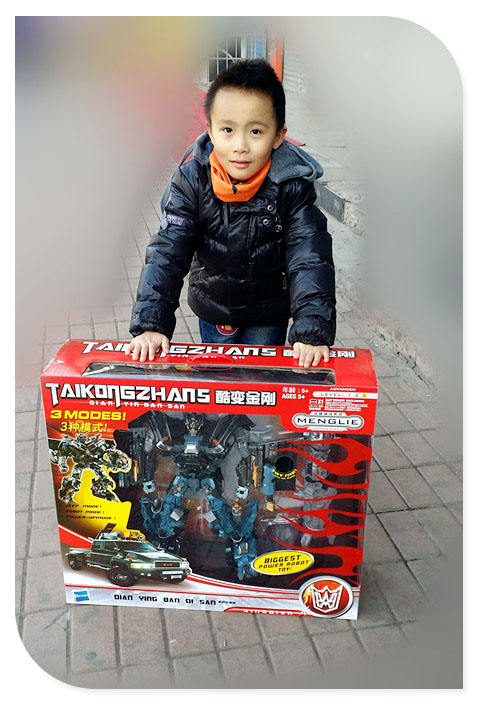 年前姥姥就许诺小家伙年后去姥姥家的时候会带着小家伙买个喜欢的玩具,大年初五当我们去看姥姥的时候,小家伙格外的兴奋,这小子一门心思的就是让姥姥带着去选玩具呢!因为过年的缘故,好多玩具店还没有开门呢,不过有几家倒是把店内的各种玩具都搬出来在门口堆积起来,那个规模很大,绝对吸引孩子的眼球啊。再说谦看到姥姥后简直是一刻都不肯耽搁的就要出门啊,姥姥骑着自信车推着小家伙开始了我们的选购玩具之行。 小家伙想买的玩具就是变形金刚了,因为看过变形金刚四的缘故,所以又格外的钟情禁闭、惊破天的变形金刚人物,此行也是奔着这种玩具去的。可是开业的玩具店本身不多,小家伙又目标明确的不肯改变,直到看到这个超级大超级酷的“铁皮”的时候,这小子完全被沉浸其中了,打听了一下价格要400元,妈妈讲价问便宜点多少钱,结果也要350,妈妈还是嫌贵,虽然店家一再说是正版的,可是还是高于妈妈的底线了,于是拉着小家伙走去其他家在选选吧,可是这小子却心中只有“铁皮‘,其他的都不入眼了,以至于又哭了起来,姥姥一看小家伙哭就受不了了,又跑到那家去讲价,可是人家一看孩子哭更是不肯降价了,最后只是少要了20元,给小家伙买了这个超级变形金刚大铁皮,而小家伙拥有了心仪的礼物则是离开眉开眼笑起来。对于小家伙用哭的办法来赢得喜欢的玩具这方法妈妈是很不喜欢的,可是姥姥却说大过年的给孩子买一个是可以的,不过妈妈也跟姥姥讲好以后教育小家伙要听妈妈的,妈妈不同意的事情姥姥要配合。对于小家伙的这个行为妈妈也跟孩子讲了,下不为例,以后越哭越不买。 这款变形金刚的人物是变3里面的铁皮,家里有个小号的。相比之下这个可以算是超级大了。看看装的盒子个头就大,而且拎起来分量也很重。看看小家伙和包装盒的对比就知道大小了。