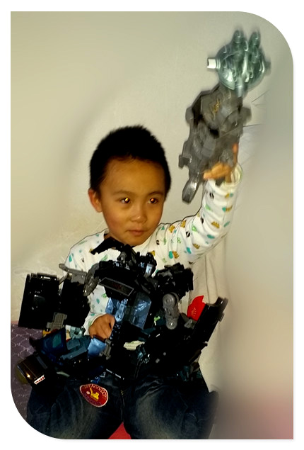 想给铁皮单独拍一张,也遭到了孩子的拒绝,人家还要玩呢! 单独的变形金刚个头也很大的,而且功能也特别,还有独门暗器的巧妙开关 另外单独的武器装备也很酷的,希望小家伙能玩好!玩长久些......
