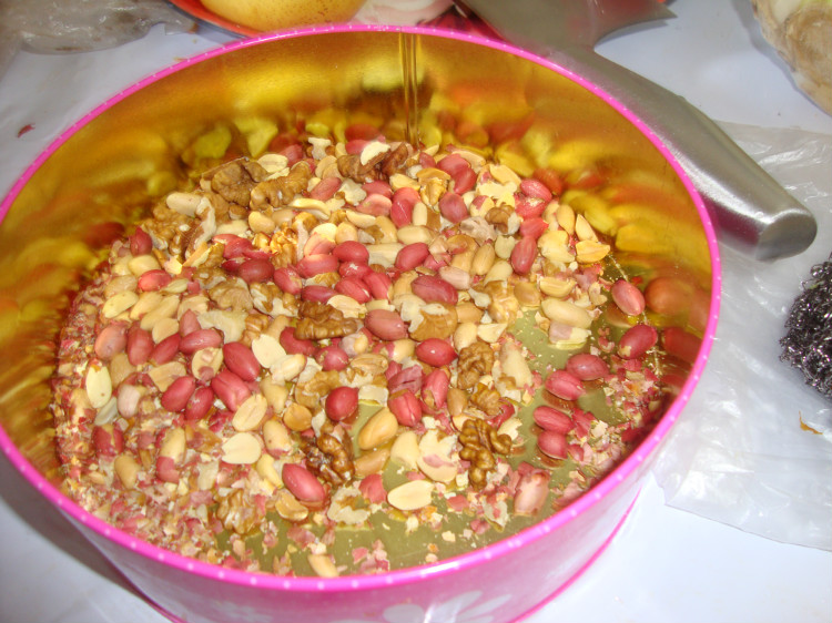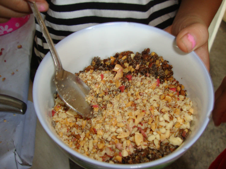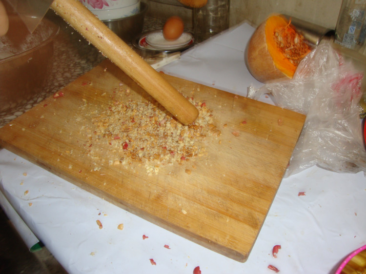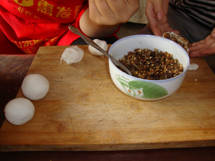 准备馅料,我用白糖红糖配花生碎、核桃仁碎;