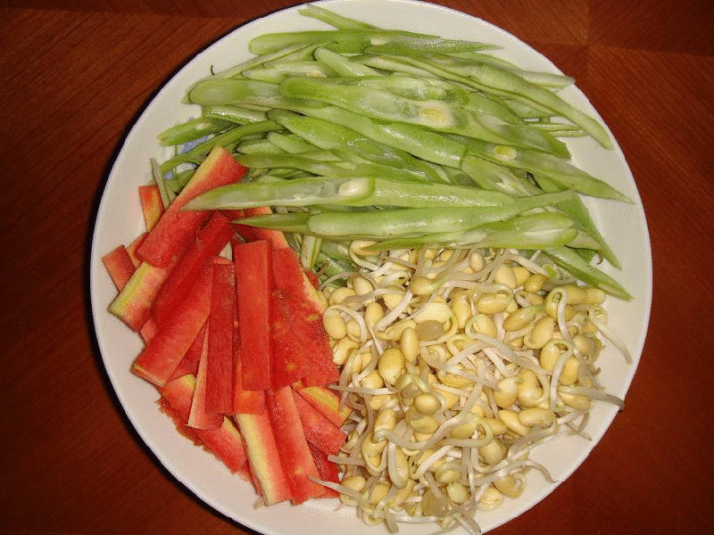 1、准备蒸卤面的蔬菜,种类很多,大家挑自己喜欢的就好。当天家里现成的几样菜,我就选了胡萝卜含有维生素A,黄豆芽具有很高的钙,豆角含有较多的维生素,三个搭配还算合理,营养丰富。
