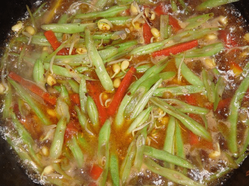 2、将切好的菜炒八成熟加水,加各种佐料,佐料根据自己口味调配,加红烧肉最好吃,这里有一点要提醒大家,水要少一点,别把菜弄的太烂糊了,因为一会还有一个加工的过程,所以生一点即可,还有我自己的习惯,是先放入豆角,因为都说豆角如果不熟透会产生一种毒素,所以每次我做豆角都会多一些时间。