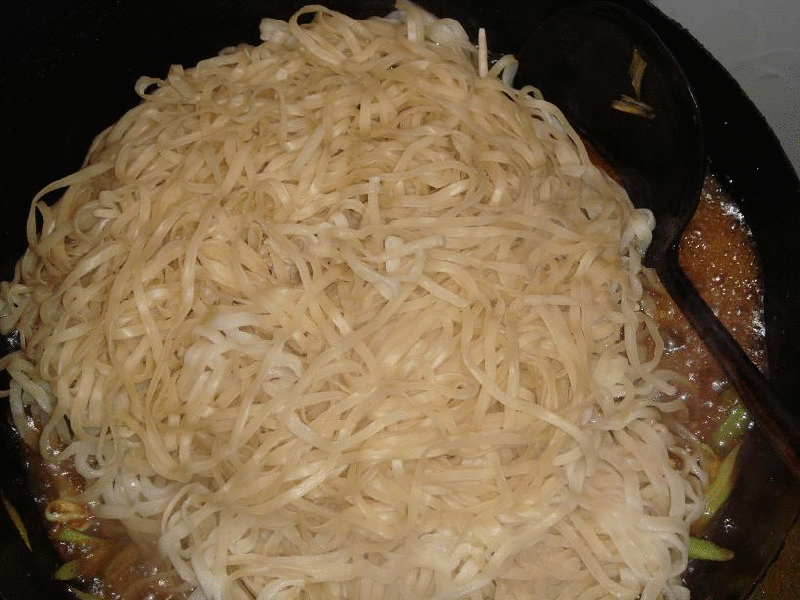 3、水快煮干的时候把蒸熟的面放在菜上搅拌拌匀,由于我当时临时决定,老公没买到,所以就只能用普通的面条了。现在卤面超市里都有的卖,亲们如果想做的时候可以去采购完在做。