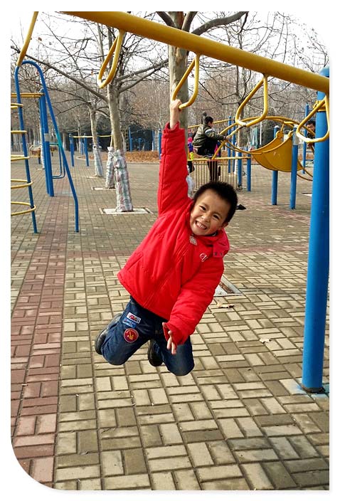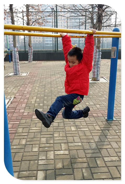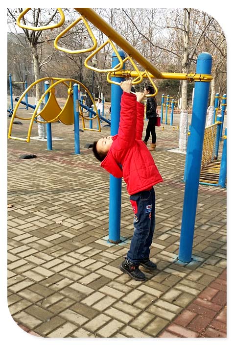 这个器械的抓环设计是层阶梯递进的,也是小家伙玩耍的第一个器械。先是双手抓住合适的高度,然后身体后仰,这算是抻抻腰活动一下身体,也是正式锻炼前的小热身吧,这样挺好的,有了前面的活动预热可以避免真正锻炼时候对身体造成的不必要伤害。就这样活动一会后小家伙开始向更高一点的跳起抓住。这次出乎妈妈意料的是小家伙居然是单臂抓住的将自己的身体悬了起来,不知不觉小家伙的臂力真是大有长进的。后来妈妈给谦爸学这件事情的时候却遭到老公的批评,说是孩子还小,以后不要做这样的动作,很容易拉伤手臂的,这个阶段孩子受伤恢复是不容易的。妈妈倒吸一口凉气啊,好庆幸啊,孩子没事。不过也借机跟小家伙说了这事,锻炼身体是好事,安全则是更重要的。