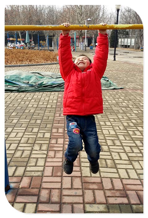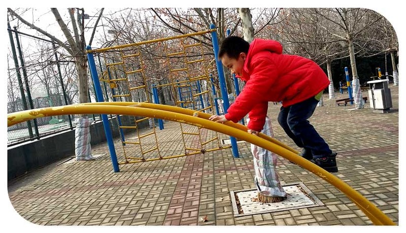 冬季里难得有好天气的,更难得是天气晴朗而阳光又暖暖的舒服天气。幸运的娃碰巧拥有了这段和温暖拥抱的机会,成全了宝贝可以痛快玩耍器械的好时光。基本上小家伙的冬天里玩耍器械的时候是很少很少的,冬季寒冷,而器械又都是铁制的,不知道带手套的小子想要玩器械是不是难事一件啊,小手把握在铁杆上没几分钟就会嚷嚷着太凉了而放弃。 小家伙中午睡觉又没成功,开始张罗着出来玩,于是就来到了公园,这里距离超市比较近刚好玩过后还可以直接买点东西,方便的很。因为天气好好,所以来到公园的我们直奔器械区域。公园里的器械项目还是挺丰富的,锻炼腿的,臂的,腰的各有各不同,看你的选择了。对于谦来讲最喜欢的还是和杠有关的了,吊在上面玩对于孩子来讲简直是有趣极了,于是乎单杠、双杠、凡是可以让娃抓住悬挂在上的都成了宝贝喜欢玩的项目。