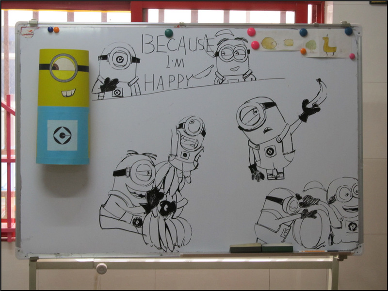 寒假儿童创意班中,Aric多数是以手工画为主,就像这次这节课,主题为《小黄人》手工课。Aric很喜欢小黄人,我想看过神偷奶爸的孩子应该都会喜欢里面那可爱又有趣的小黄人吧,Aric就是一个很喜欢小黄人的孩子。从上这个创意班开始,Aric也做过几次手工,有海绵宝宝的折纸课,还有哆啦a梦的轻泥课,都是很有趣的,而这次的小黄人手工课不止有画画还有折纸,以及装饰等元素。 《小黄人》手工课所需材料:彩色卡纸、马克笔、剪刀、双面胶;这节课的目的就是培养孩子装饰及动手能力。重、难点是对小黄人的认识程度,小黄人丰富的表情。接着老师会在小黑板上画出各种小黄人的素材,让孩子们慢慢的去认识小黄人,然后通过认识再来绘图、折纸,这样难度也会容易一些。我觉得老师画的真是很漂亮也很形象呢,一只眼睛、两只眼睛、调皮的、吃香蕉的…都有。