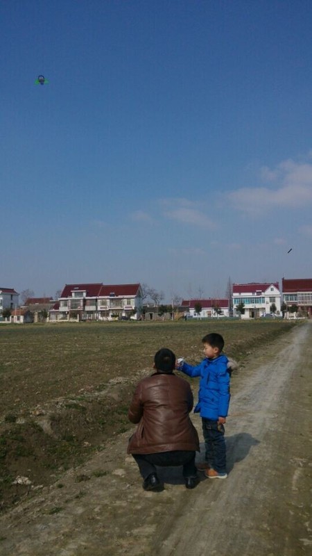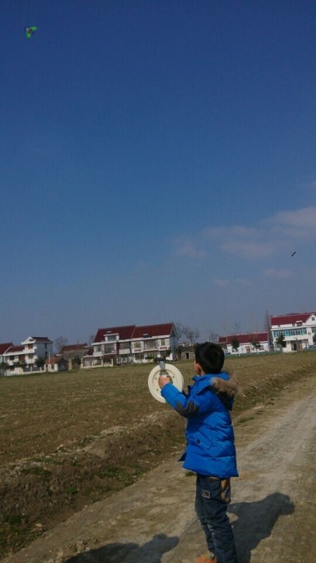 我们一路小跑来到了田边,我怕冷,戴好帽子,戴好手套,给他们父子俩拍照,点点爸爸把风筝往天上一甩,风筝就飞上天了,很快飞得很高了,一会儿风小了,风筝有点往下掉了,爸爸用手一甩,风筝又上去了,过了一会儿风筝就很平稳地飞在天空中了。