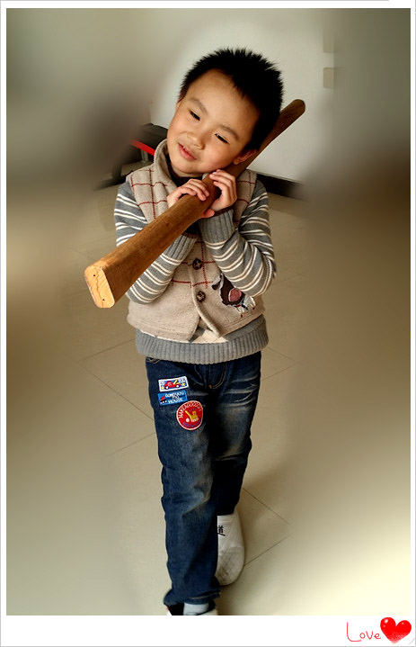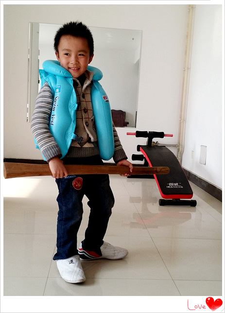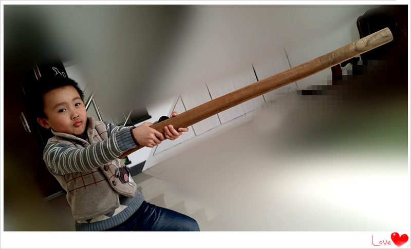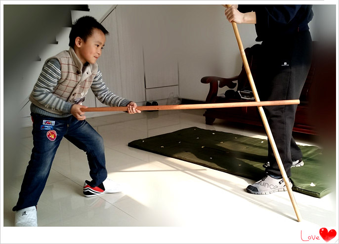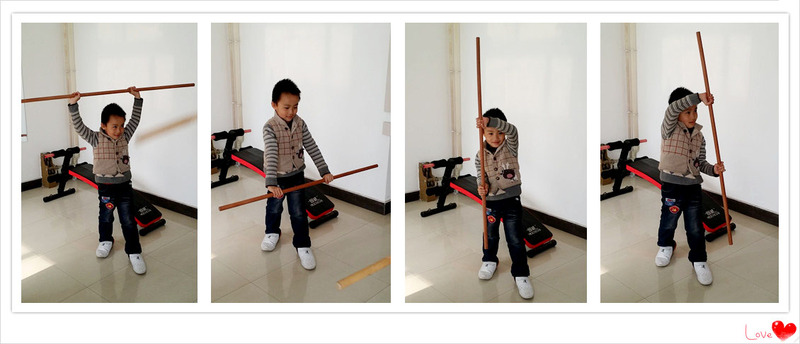 小家伙从小都大都很喜欢玩棍子的,这次记录一下宝贝跟爸爸玩棍子的事情吧。那一天小家伙找出一根看起来很棒而且拿在手中玩耍也很合适的棍子。这次玩棍之前,宝爸还特意教了小家伙几个耍棍的动作,看上面的照片就是小家伙学习动作的摸样,拿棍的小子比划的还有模有样呢,上、下、左、右的,宝贝还挺认真的。小家伙当时穿了一双爸爸的鞋子,小脚丫穿大鞋子让宝贝在行动起来多有不便,可是小家伙还不肯换鞋,只好这样将就着进行吧。