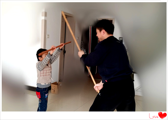 宝爸也拿了一根更长的棍子,如此父子之间的棍战正式拉开序幕了。刚开始的时候,小家伙只是拿着棍子乱打,毫无章法的。后来随着爸爸的演示小家伙也终于知道了拿棍子抵挡防御的动作了,左挡右挡的还真是紧忙乎的状态。从防守到出击,宝贝是越战越勇。妈妈在一旁一边很有兴趣的关注着父子同玩棍,一边拿着手机饶有兴趣的记录这美好的父子嬉戏的画面。不过后来小家伙又开始胡乱打起来,老爸也不陪着臭小子同玩了,余下则是宝贝一个人的玩棍时间。
