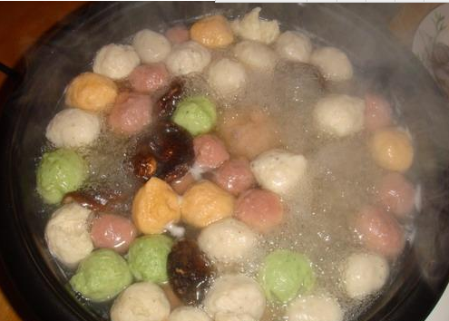 那个五颜六色的丸子真让人心动啊,没涮过鱿鱼须呢