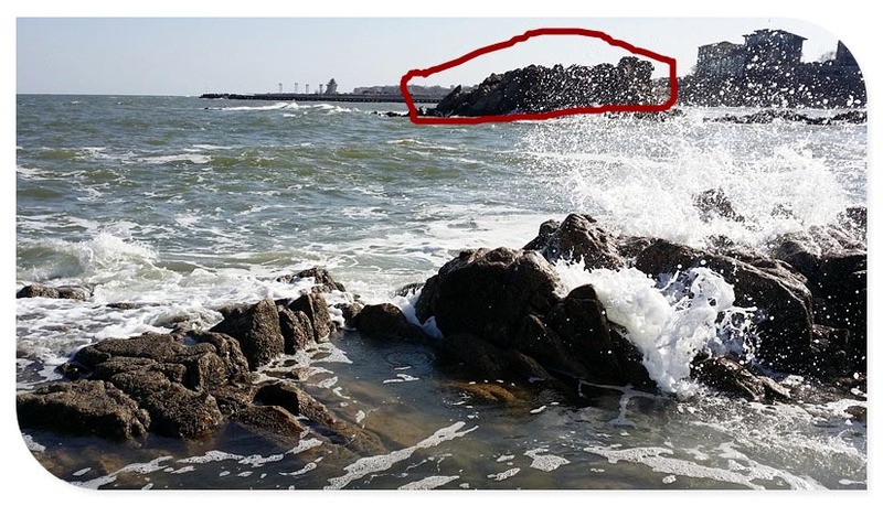 照片中表示出的红色区域是小家伙突然想要去的地方,单看则是无法到达的,大岩石和大岩石之间那是波涛汹涌的大海浪,来势汹汹的席卷过来,妈妈摇摇头,想去哪里是不可能的,还是看看得了。宝爸却积极的说可以过去的,此话一出立刻让小家伙兴奋不已,拉着老爸的手马上就要走。妈妈本来不想去,可是小家伙坚持只好跟着这两个男人一起折腾了。要知道到达此处需要绕过高低不平的岩石,还要走弯曲狭窄的土路,总之这个路是真不好走啊,上下起伏好大,简直相当于一次原始爬山了。而且还需要大人一手领着孩子,如此更加的增加难度了,更要命的是妈妈穿的可是皮靴啊,走起路来更是不方便,哎,真是服了他们了,要跟上儿子的节奏还真是挺考验的,反正就是很努力,很努力,很累的才到达了目的地......