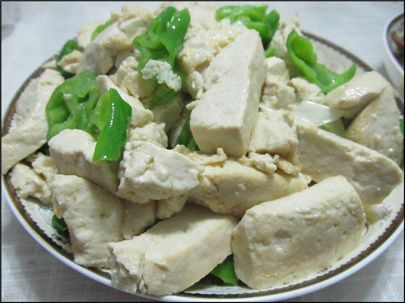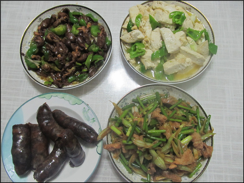 为自己炒了一盘蒜薹米豆炒肉,把蒜薹切成小条状,而米豆也切成了丝状,这样比较搭配一些。洗干净放盘备用,先把肉炒喽。选的是瘦一些的五花肉,Aric爱吃肥肉啊。然后炒的时候放一些酱油,炒熟肉以后把蒜薹和米豆放入锅中翻炒,最后加入调料装盘即可。最后炒一个青椒炒豆腐,很清淡的一道菜,不知道怎么回事,最近特别爱吃豆腐,这次炒的卖相不错,最起码没炒烂。 想着凑四个菜吧,就取了两根香肠掰开然后放入蒸锅中蒸了一会儿,没有切成片,因为如果切片没吃完就会发干,以后就不能吃了。这样掰成几节来吃,感觉更爽一些,哈哈。做好了四道菜给老公打了个电话什么时候回来?老公说还得十几分钟,好吧,反正时间不久就等了等他,主食是馒头,喝的都是买回来豆汁熬开了,比较省事。简单的四道家常菜,每个人都有不同的喜好,也算都满足了一家人。 ![]() 上是鸡心青椒,下是豆腐青椒。 ![]() 蒸了两根香肠,掰成了几段,没有切片。 ![]() 米豆、蒜薹炒肉,我很爱吃的菜呢。 ![]() 刚出锅的四道菜,等待老公回家来吃饭喽。