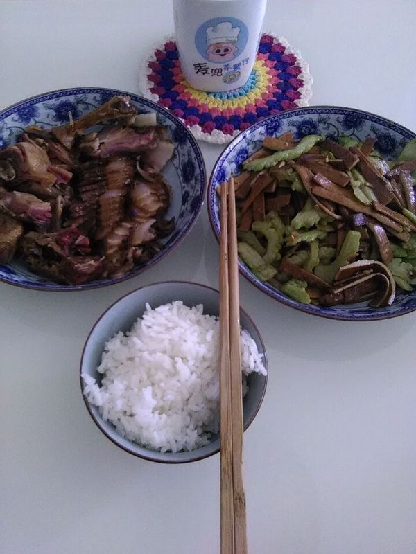 今天一个人在家,一个素菜苦瓜炒豆干。最近新搭配的,觉得还不错。今天又做了。 家里拿来的腊肉和腊鸭腿,冰箱里还有好多。平时都不想吃,今天一个人不用炒菜了。 不想烧汤了,加个开水就好了。