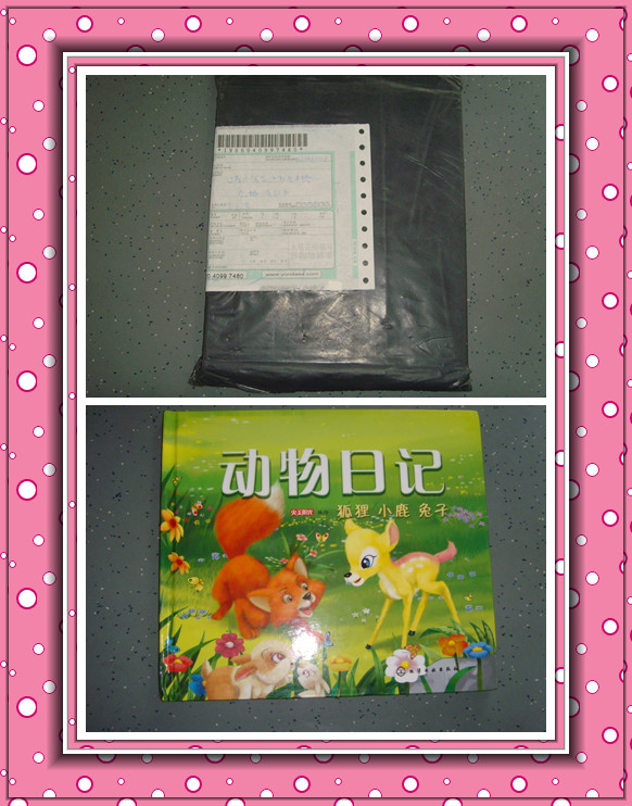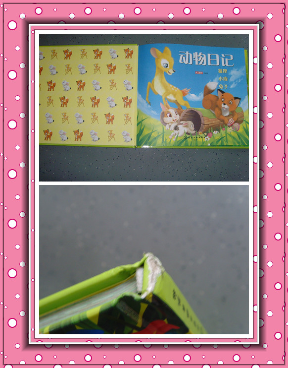 这次试读一共有4本书,我很喜欢《动物日记·狮子老虎狼》这一本,因为宝宝比较喜欢老虎,看到老虎的图片会学老虎的叫。兑换好了运费我就开始等待我的书,呵呵,这还真是一个漫长的过程啊! 6月2日下班回到家,看到了一个很薄得包裹,呵呵,这个肯定是中的绘本,拆开来一看,果然是。可是包裹拆开来我的心就有点凉了,一是我收到的并不是我想要的那本,我收到的是《动物日记·狐狸小鹿兔子》,这三种动物中宝宝只认识兔子,不过这个还好,可是还有一件令我更郁闷的事情,我收到的书有点问题,书的左下角有磨损,有点坏了。书收到了,可是出现这样的情况弄的我都没有心思写试读报告了,就把书放在楼下了。